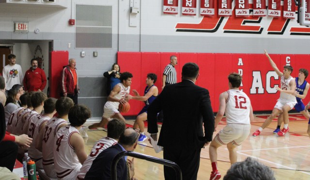 In the fourth quarter, a pair of Tipton threes—one from Ryan Tracy and another from Carpenter—sandwiched around a pair of free throws by Schultz put the Blue Devils up by 12 at 50-38. When Carpenter made it a 14-point lead with a fast break layup with six minutes left, it looked like the Jets were finished.
